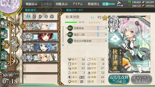 6-4秋津洲ルートなんかで航巡に瑞雲系を積んでいったりする場合に艦隊の疲労抜き中に秋津洲のキラ付けと瑞雲系の熟練度上げも兼ねられていいと思います。 随伴はできればLv1駆逐。Lv1軽巡だと秋津洲からMVPかっさらうこともあるので 1-5を1周した後…
